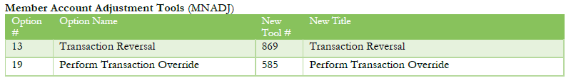 These new tools include options that currently exist on the Update Functions 1 menu (MNUPDT), Update Functions 2 (MNUPDA), and the transaction reversal and transaction override options on the Member Account Adjustment Tools (MNADJ) menu. (For your reference, the following tables includes both the current menu/option number and the corresponding new tool number.)