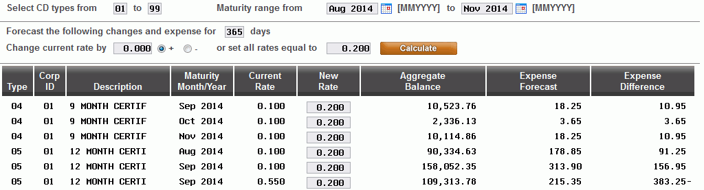 By selecting individual CD types that represent key maturity blocks, and forecasting either a deviation or consistent rate, you can measure the effect of different strategies on a single set of certificates.