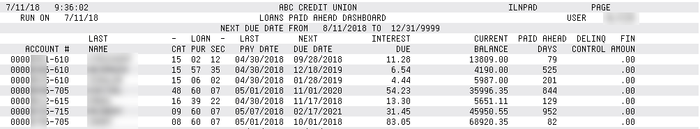 Your credit union's policies may wish to limit how far ahead members pay their loans. This dashboard helps to identify members who are paid ahead (31 days and greater). It can also be a good analytical tool to make sure due dates are within reasonable tolerances on member loan accounts (for example, you may find where error corrections have been posted where the due date was advanced incorrectly, or accounts where maintenance was done in error).