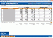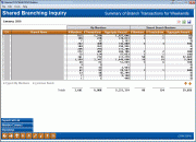 Data on this screen includes the credit union two-digit combination, the branch name and also the following information for both your member activity and the activity of shared branching members: the number of members who visited that branch, the number of transactions, and the aggregate dollar amount of those transactions.