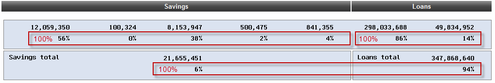 The bottom portion of the screen provides averages and a percentage of the total for savings, loans, and all balances: