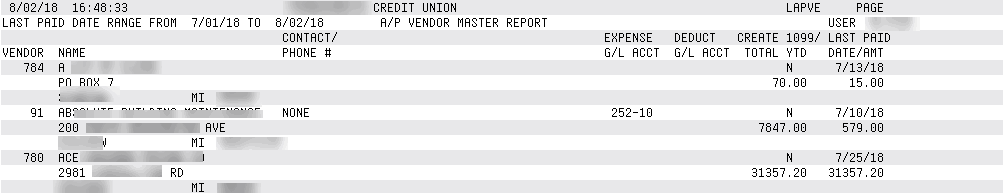 NOTE: The “SU” column at the end of the report will show an asterisk (*) for suspended vendors. (Not shown in this example. You may need to scroll right to see this column.)
