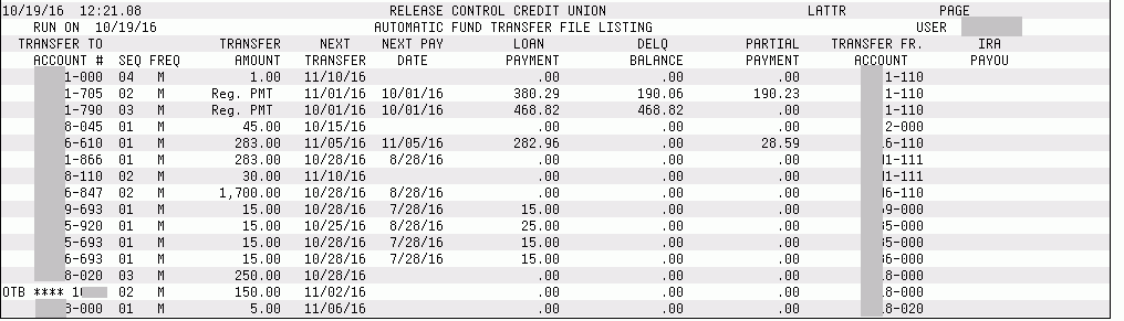 Use this screen to print a listing of all automatic fund transfers with additional information about loan accounts if relevant.