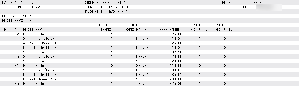 This report summarizes data from the teller receipt history file and therefore will actually be pulled for a period of up to the last 90 days. This report includes all activity done at the teller window, whether a member transaction or not, by audit key.
