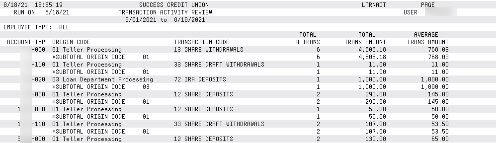 This report summarizes all transaction activity for special memberships. It uses the HTRANSx file and summarizes statement information. The Transaction Activity Review report is used to check larger dollar online banking transactions, certain types of teller transactions (ATM deposits, drafts clearing), and fee reversals which show as account adjustments.