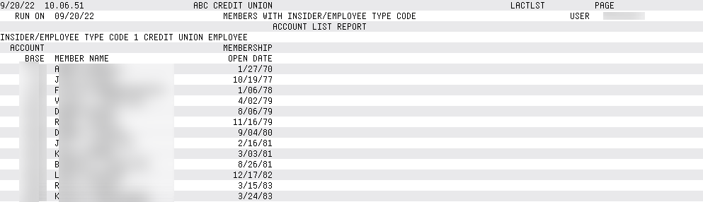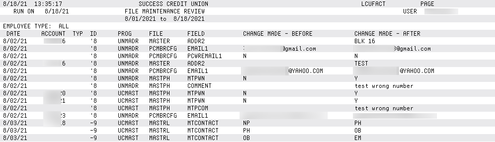 This report compiles all file maintenance completed on a special member account in the CUFMAINT file. It pulls all CUFMAINT records where there is an account number in the Acct field that matches a special employee membership. Excluded from this report is activity by Employee IDs from 96-99 and system-generated maintenance.