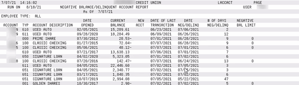 This report compiles a list of only accounts that are currently delinquent or have a negative balance. These are members who have negative share accounts and/or delinquent loans as of the current day. Data for this report is from the current MEMBERx files.