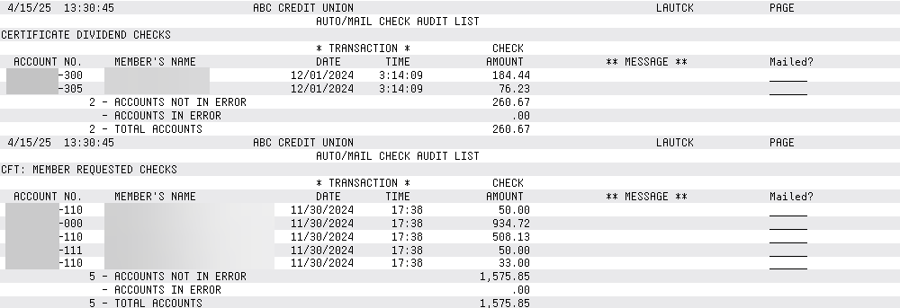 This screen is used to print a report showing all of the auto-generated checks that are waiting to be printed and delivered to members. For any check type to be included on the report, place a check in the row. Each will appear on its own page, with subtotals for each check type.