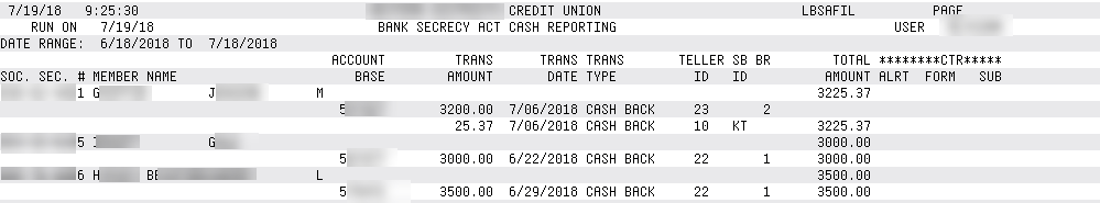 Looking for a more comprehensive report that includes joint owners, to help you see signs of structuring? Try the BSA/SAR Structuring Report instead, available via Tool #1990 Print BSA/SAR Structuring Report.