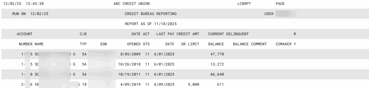 For example, if your credit union reports to the bureaus every month (as most do), this report will reflect the information that was reported at the beginning of the current month. Credit bureau tapes are generated during the first week of the month for online credit unions.
