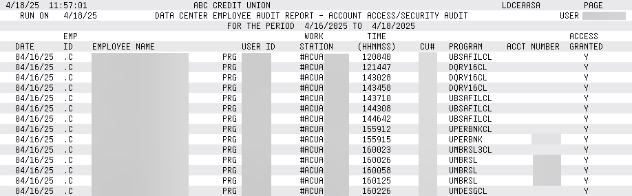 These reports audit activity (transactions, file maintenance, and account access) performed by data center employees, which include CU*Answers, Xtend, and Xtension staff and other shared-resource employees. These reports only include records if the Emp ID is "AA' (all datacenter employees), 89, 98 and 96. All of the reports, with the exception of the Account Access/Security Audit Report do not include online banking/ARU activity or system activity under alias 99.) The Account Access/Security Audit Report does include activity via online banking and ARU.