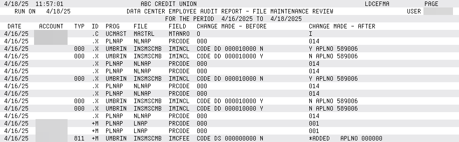 This report compiles all file maintenance completed by a data center employee during the selected date range. This report uses the CUFMNT file for current month and its end-of-month equivalent for past file maintenance. To run the file maintenance review, the selected date range must stay within a month and cannot span multiple months. Click here for a list of common program names.