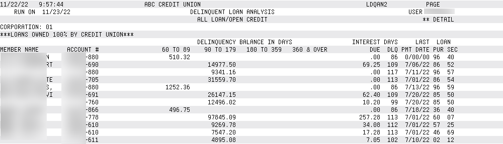 Unlike the Collections Delinquency Report, which is grouped using your credit union's configured categories, accounts on this report will be grouped according to the number of days delinquent. This report is ideal for reporting delinquency status to a Board or auditor.