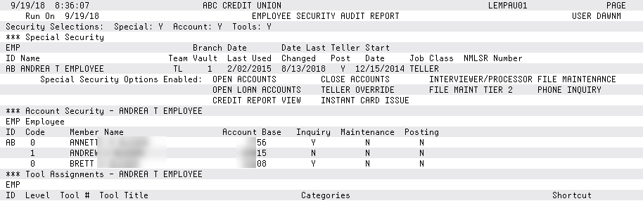Check this to include on the report the employee's access to special CU*BASE features such as opening and closing accounts, configured via Update Special Security. |
