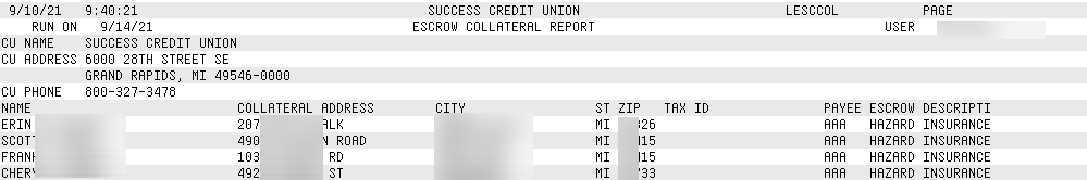 This report displays information for members with future escrow disbursements. The report can be run by escrow payee or escrow type. The report lists the member name and collateral address and collateral tax ID (which are pulled from the first collateral record on file for the member) along with the associated payee and escrow type description.