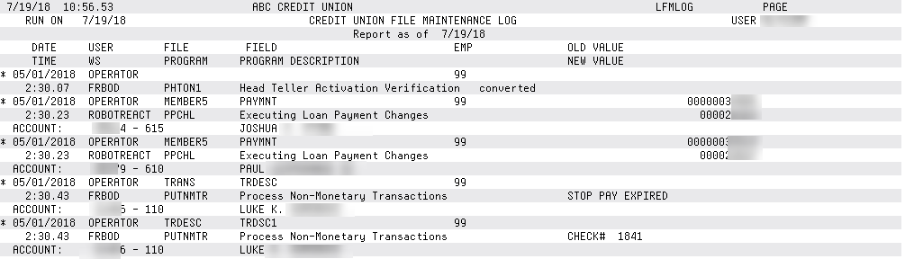 This report prints an on demand version of the CUFMAINT data. It is a great report to use for more extensive research pertaining to maintenance which has been done on a specific member’s account or over a specific period of time. No need to pour through days of maintenance logs looking for each instance of maintenance on that one account. Use this report to monitor employee activity and to watch for suspicious activity. View this data a month at a time or a single account at a time so that you can either view all the maintenance done or hone in on a specific account you are monitoring. This report can be used in conjunction with the online File Maintenance Inquiry dashboard and the CU*Spy End-of-Day Maintenance Log CUFMNT Version Report (LELOG2).