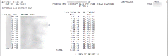 NOTE: This report only lists the interest on paid ahead (not regular) payments for Freddie Mac loans. Paid ahead payments are identified by Tran Code 22 and Tran Type 15 in the TRANS2 file