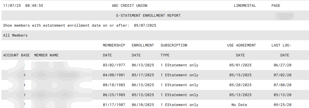 Show members with E-Statement Enrollment Date on or after mmddyyyy |