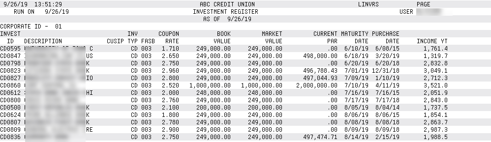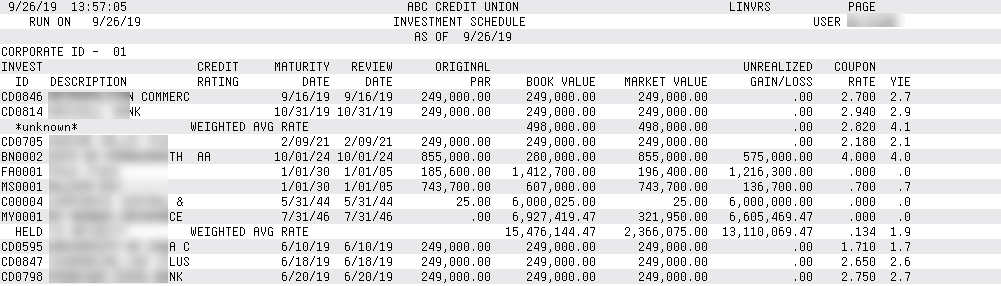 This screen is used to print a basic report showing a listing of your current investment portfolio. There are two formats, both of which are excellent for use by the Board and Investment Manager for routine analysis and tracking of your credit union’s investment position: