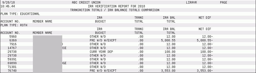 This report is used to compare the totals of the members' IRA transactions by IRA Plan Type and Code to the IRA reporting “buckets” in the IRA Balance File. The report shows those situations where these two totals do not match, broken down by Plan Type. Records are grouped by Plan Type, then sorted by Account (corporations are combined on a single report).