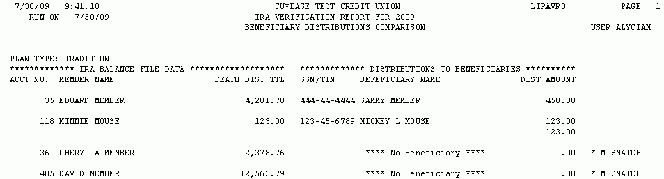 A second report prints beneficiary distribution information and lists members that show withdrawals flagged as death distributions. You’ll be able to compare the total amount flagged against the individual records of distribution as part of your regular IRA monitoring and verification activities. A * Mismatch next to a record indicates that the amount to be distributed and the distributions are not a match.