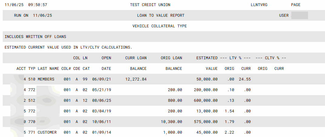 This report shows loan-to-value ratios on your loans accounts a little differently than the LTV you are used to seeing on individual collateral records. This report will calculate loan-to-value (LTV) figures based on current and original balance. In addition the CLTV can be calculated one of two ways; 1) using other debt manually entered on the real estate collateral record, or 2) using all loans sharing the collateral (entire portfolio)