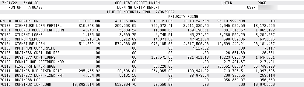 This report monitors the credit union’s loan portfolio by G/L until the loans mature. This report can be used to monitor the loan income as it matures.