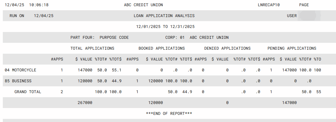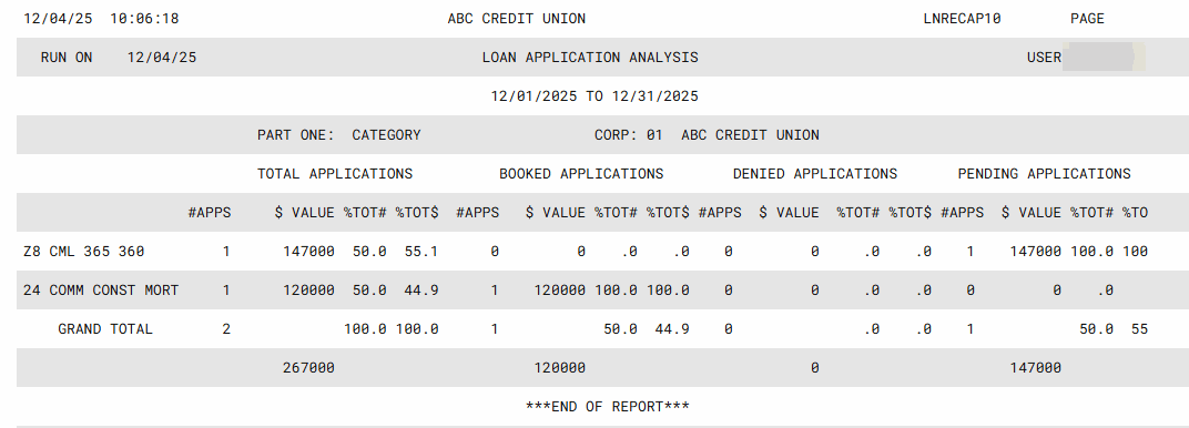 Place a checkmark on one or more of the seven different report formats to choose how the report data should be organized. For example, the “Part One: Loan Category” format shows total applications listed by loan category code. (See the samples shown below.) |