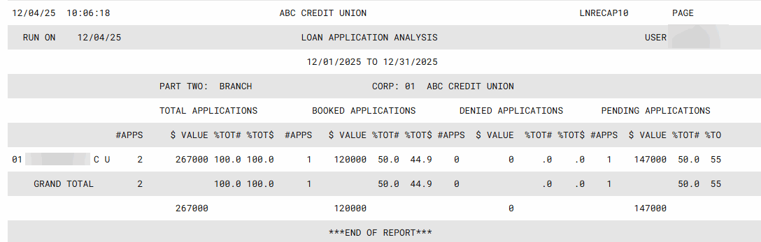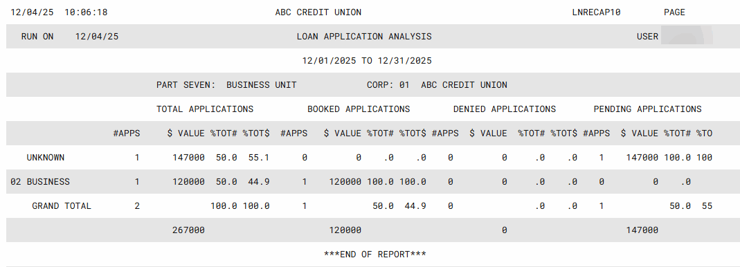 If you wish to narrow the scope of the report, use one of the following three fields: A single business unit – Click the Select key to reveal a screen. Select one Business Unit code to show only applications for that business type and use the Select option to return to the report filter screen.. A single category – Click the Select key to reveal a screen. Select a Loan Category code to show only applications for that loan type and use the Select option to return to the report filter screen. A single branch - Click the Select key to reveal a screen. Select one location/branch number to show only applications for that member branch, then use Select to return to the report filter screen.