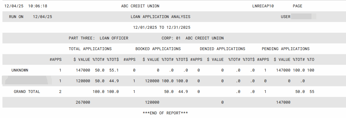 Remember that the system retains just one application on file for every member who has processed a loan through the CU*BASE lending software. It also will retain all activity for the last 60 days or two calendar months. Therefore, if you choose a date more than 2 months ago, data may be incomplete.
