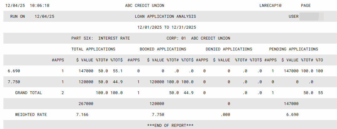 To make that picture even clearer, the Application Analysis Report shows a full statistical analysis of six different areas for the month's loan application activity. Each area is broken down into an analysis showing total applications processed, as well as the totals for Approved, Denied, and Pending applications. With this tool, one report can show you a summary of: