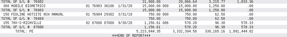 This screen is used to print a detail report showing the current state of all subsidiary records by item type (AE, BA, FA, LA, LI, and PE). This report can be customized to provide only the records desired, based on parameters you specify in the area below. If you use a Select button, you can filter the report to only use selected item(s) If nothing is selected, all items will be included. The ranges allow you to select to include a range of items. If you wish to only include on item, enter it in both fields provided.