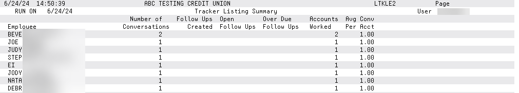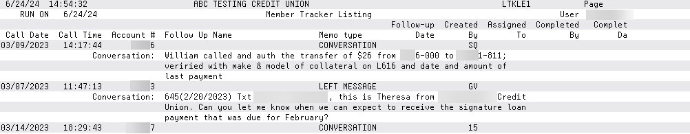 This screen is used to print a report showing all conversation records stored on the system, sorted by member account, with or without follow-ups. It is commonly used to print a report for a certain memo type code, such as if you want a list of all your “Promise to Pay” conversations from a certain time period or member account. Or, you can specify to print a report for a specific tracker type, such as selecting only your collection cards to view all conversations based on a specific tracker type. Also print a Tracker Listing Summary from this screen with numerical data on specific tracker types.