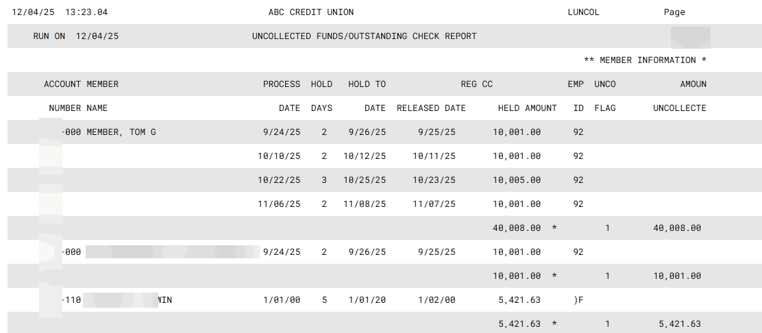 This report is excellent for monitoring uncollected funds and to view all uncollected funds information at a glance. Also use this report as an uncollected funds inquiry on individual accounts or to scan and to check that tellers have placed the holds on accounts.
