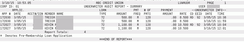 Following is a sample page of the summary report. Because the items are sorted by account number, the report makes it easy to audit the sequence of key events that have occurred for each loan request. Pre-Membership Loan Requests will be indicated with an asterisk (*) on both reports.