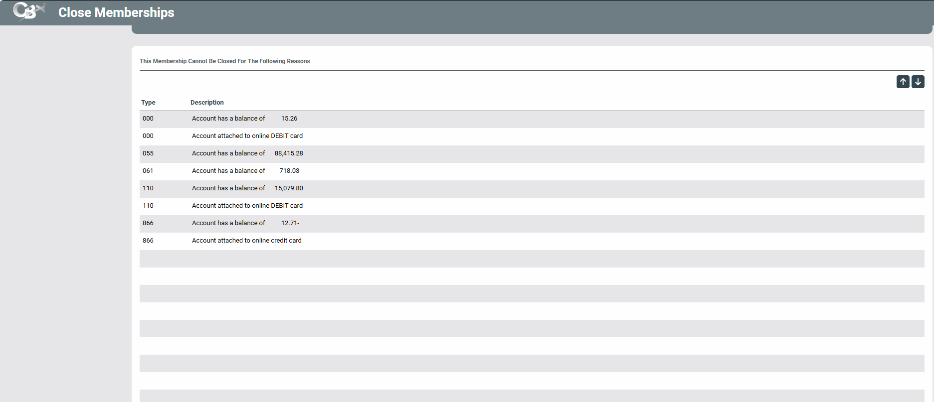 If you are closing an account, this screen shows the reasons why this account cannot be closed. (The Type indicates which sub account each item belongs to – no Type indicates that it is a membership close issue).