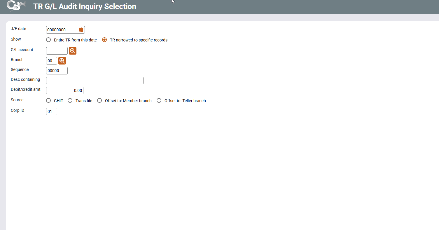 This auditing tool will help you follow the trail of breadcrumbs leading from “TR” entries to member transaction detail. You will now be able to search the “TR” by J/E date, G/L account, branch or sequence, as well as find a G/L entry and view the supporting member transactions for the entry.
