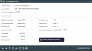 This is the final screen used in the basic loan request sequence. From here you can proceed to many different features for working with this loan, including completing the application screens, overriding loan information, approving and creating the loan, denying the loan application, and more. Think of the Recap as “command central” for working with a pending loan application.