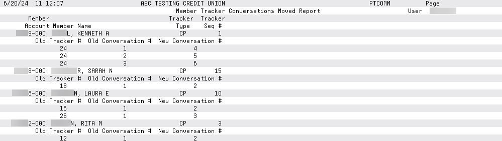 A report will print listing the number of Trackers that were combined and the placement of the Trackers on the combined Tracker. (Note the New Conversation # - this indicates the placement of the conversation on the combined Tracker.) If a specific member is not selected, the report will include a listing of all members, similar to the one listed below.