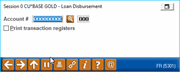 This is the first screen used to add disbursement instructions used to disburse loan funds to members, in the form of checks, member transfers or G/L transfers, once the loan has been created. Enter the account base and suffix for the loan account, and choose whether or not a transaction register should be printed. Use Enter to proceed to the next screen where you will add the disbursement instructions and post the transactions.