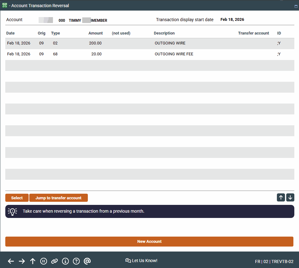 CU*TIP: After reversing the first side, when you are returned to this screen, simply select the transfer transaction again and use the Jump to transfer acct option to switch to the transfer account base. This saves having to go back to the first screen and enter the account number manually.