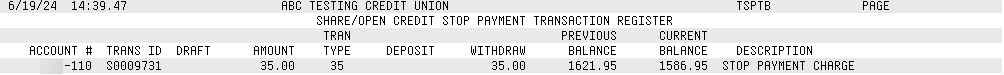 The report that prints when the Print Report of Stop Payments field is selected simply a transaction register showing the fee, if any, charged to this member for the stop payment request.