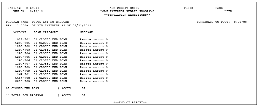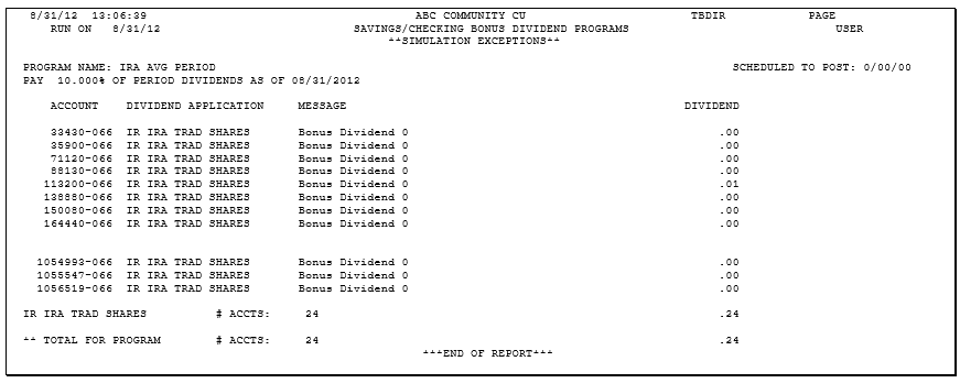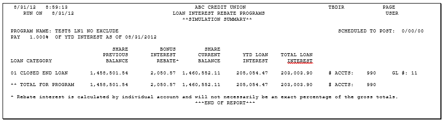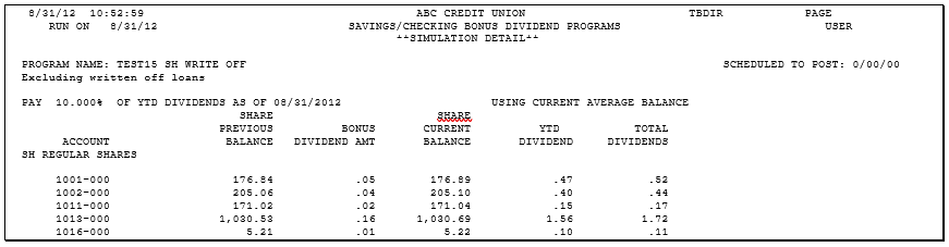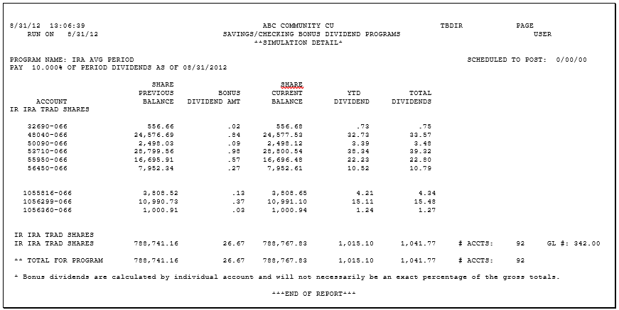 Use Run Simulation to run the simulation. At that time the three simulation reports will print. Different reports are printed for share bonus dividend programs than for loan rebate programs..