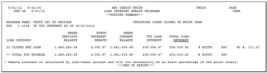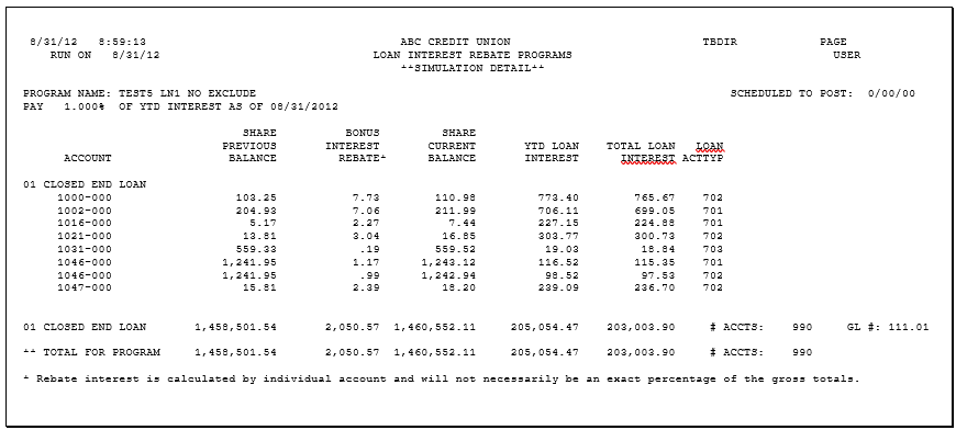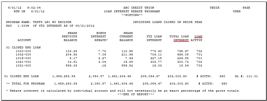 *The report above shows the change in the balance of the base share (000) receiving the rebate as well as the change in year-to-date interest. The final column indicates the suffix of the loan that qualified for the rebate.