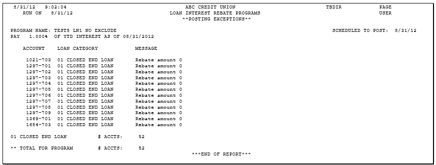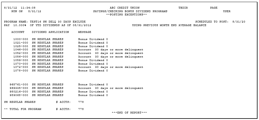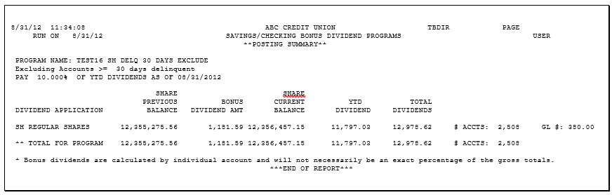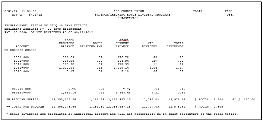 On the date selected, the program will run and the share bonus dividend and loan rebate will be paid to the base share account. The year-to-date loan interest will also be adjusted, and the three posting reports will print. Different reports print for share bonus dividend programs than for loan rebate programs.
