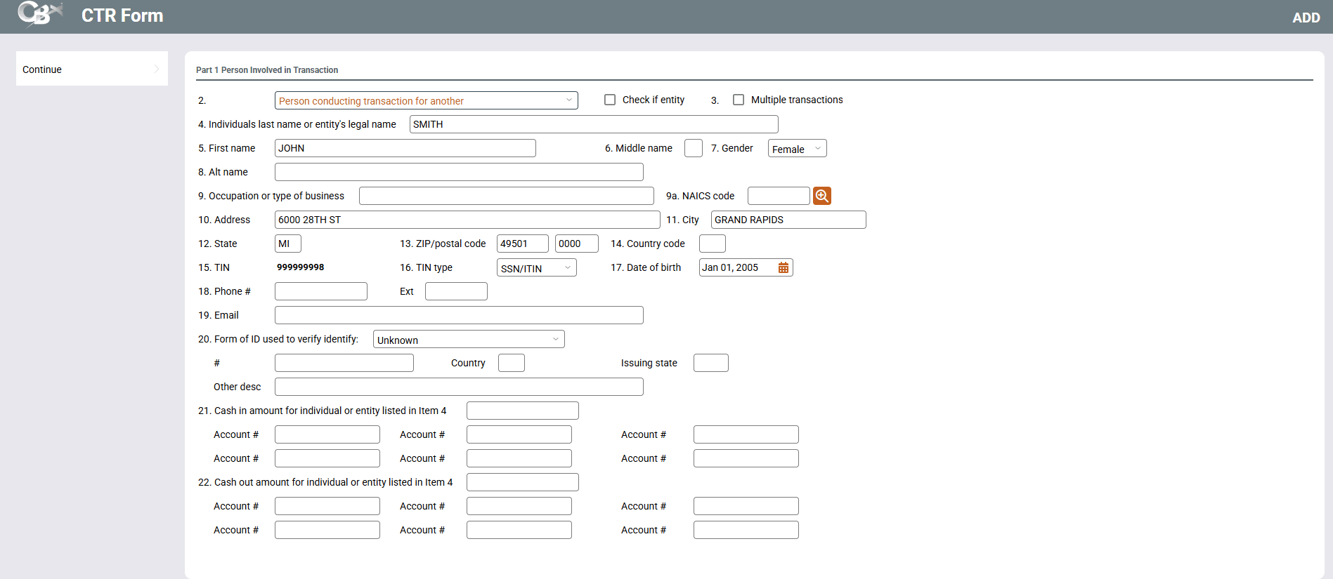 This screen is the second screen used to complete a Currency Transaction Report (CTR), when the “Multiple persons” box is checked on the initial screen. (It only appears if this box is checked. Fill in all fields according to your credit union’s policies and current BSA requirements. When done, use Enter.