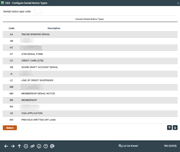 Denial Type codes are used when creating denial notice for denying a new membership, a new checking account, or other credit union products and services. This code governs the text that appears on the denial notice itself.