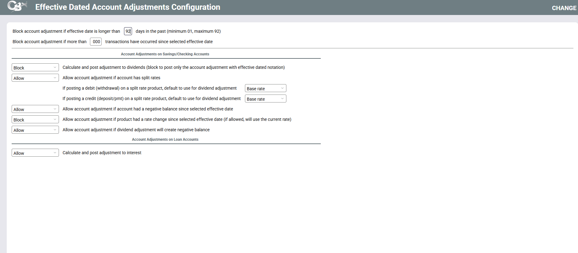 CBX has special tools that let you post a transaction to a member’s account and have the system automatically calculate the adjustment to interest or paid dividends according to the effective date of the adjustment. In a nutshell, it effectively back-dates simple, common types of transactions with a notation in transaction history indicating the effective date.