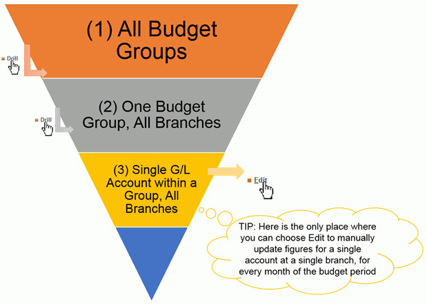 These appear on the upper levels of the dashboard, and allow you to select a budget group or a G/L account and drill down to a more granular level. You must drill down to the final level that lists your branches in order to use the Edit feature. |