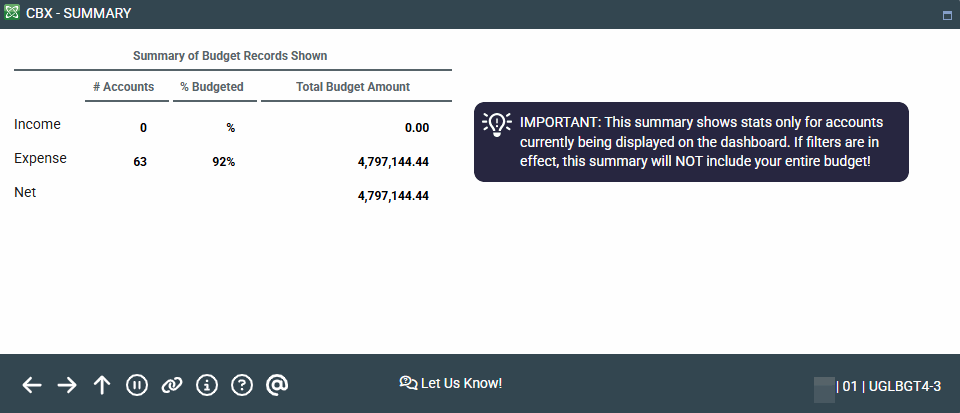 This window shows a quick summary of all of the accounts currently being displayed on the Budget Dashboard. This can be handy to get a quick look at the net income amount represented by the dashboard records, or see how many G/Ls are included in the totals being viewed.